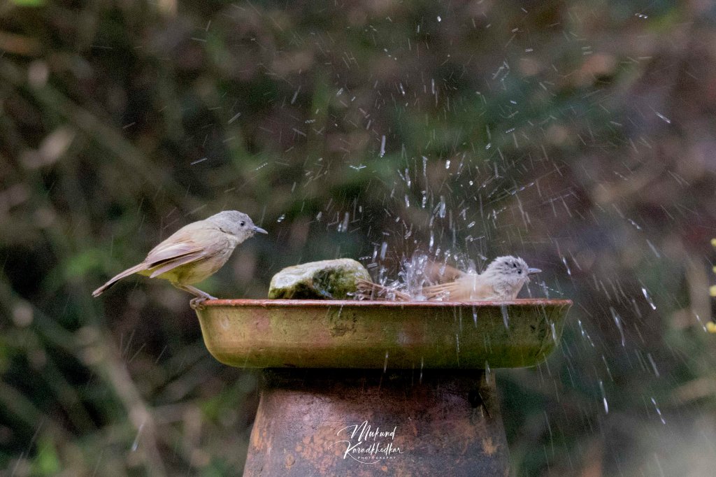 इथे हिवाळ्यात खूप विविध प्रकारचे व विविध रंगाचे पक्षी दिसतात. हे सर्व पक्षी सकाळी व संध्याकाळी आंघोळ करायला येतात. त्यांना आंघोळ करताना बघणे हा एक स्वर्गीय अनुभव आहे.खालील फोटो मध्ये आपण पक्ष्यांची आंघोळ बघू शकतो.