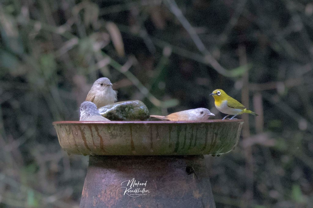 सकाळी लवकर ओएमएचच्या जवळच्या भागात फोटोवॉक करताना अनेक पक्षी दिसतात. खाली गणेशगुडीच्या जंगलात काढलेले फोटो आहेत. खालील फ्रेममध्ये तुम्हाला फेयरी ब्लूबर्ड नर, फेयरी ब्लूबर्ड मादी, ऑरेंज मिनिव्हेट मादी आणि मलबार ट्रोजन मादी दिसते.