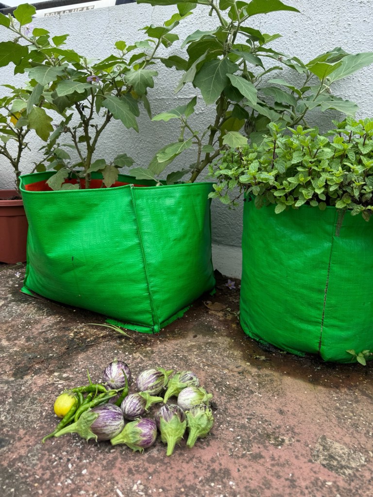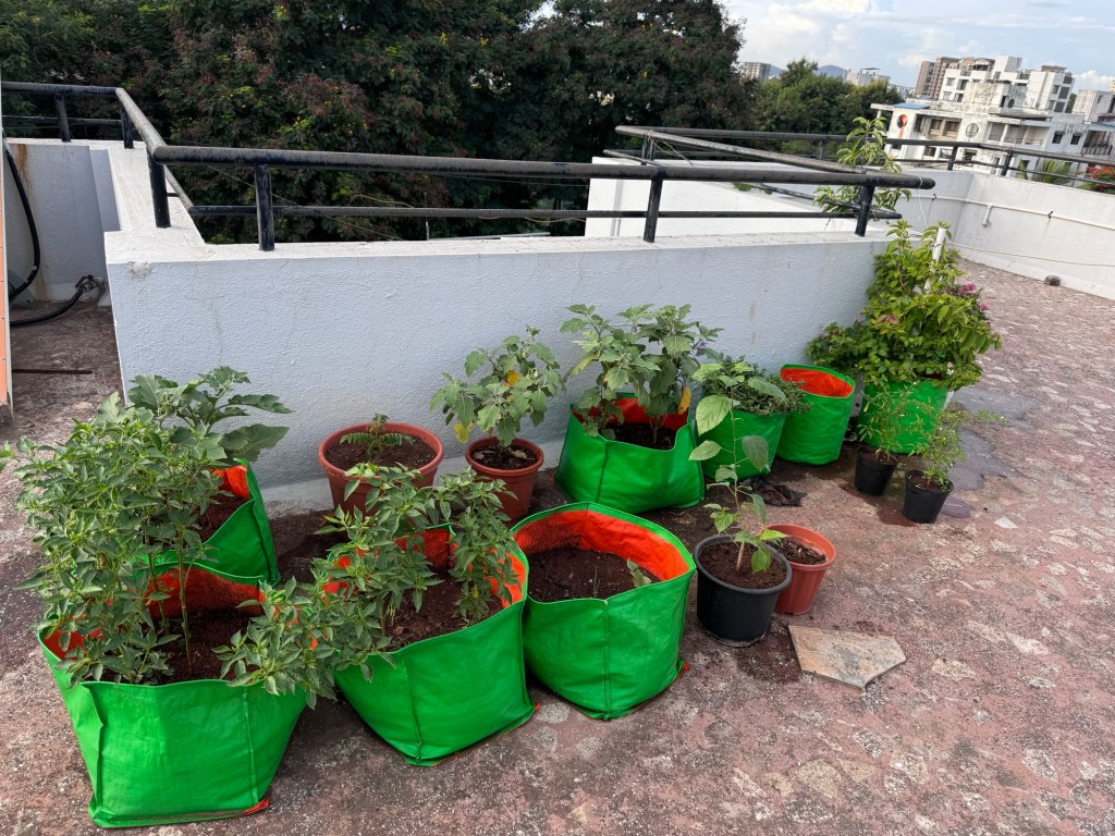 I have another garden at the building common terrace where I grow vegetables for my own consumption. I grow Brinjal, Beans, Spinach and chilli there.
